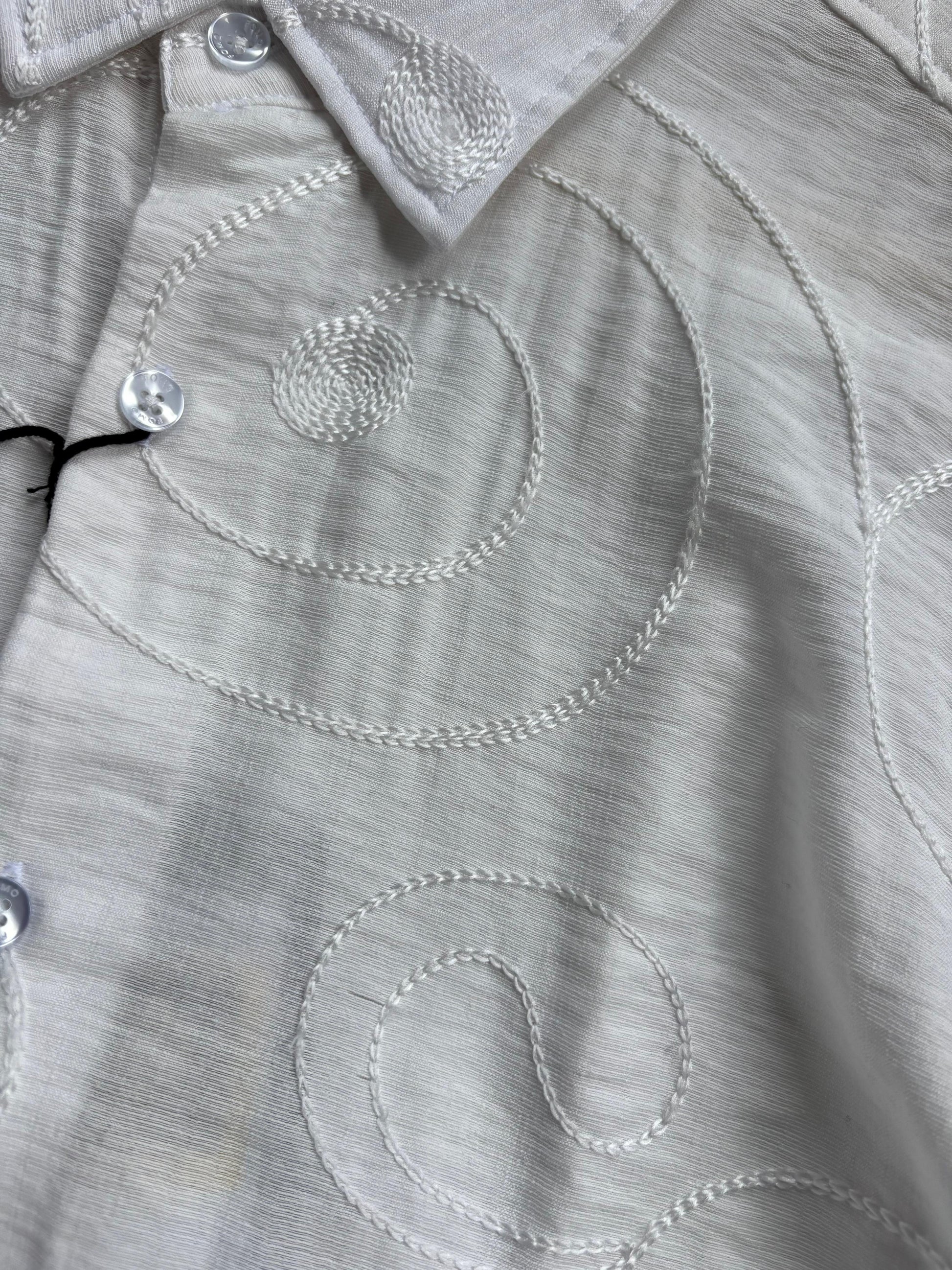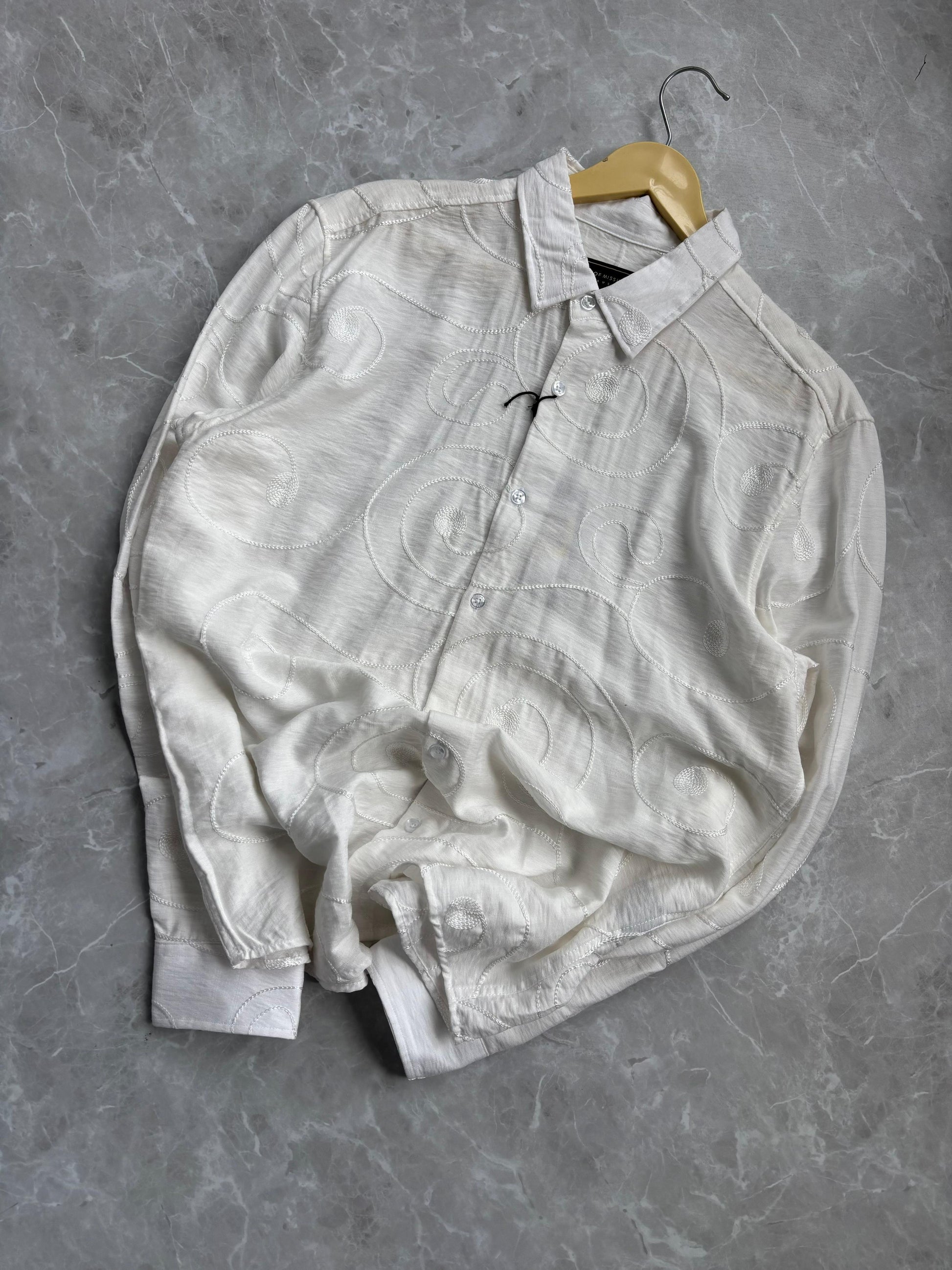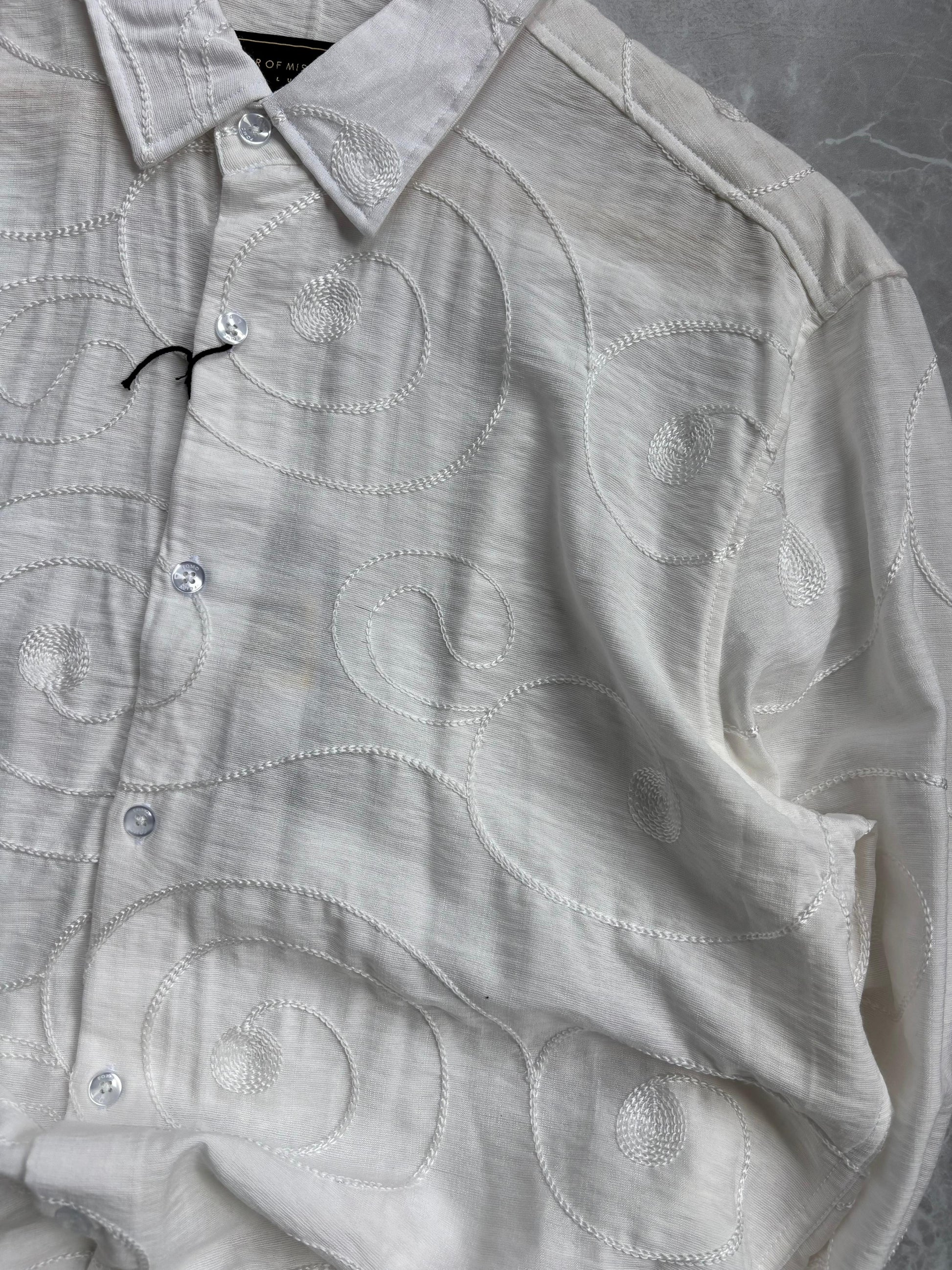 Elevate your casual wardrobe with this white embroidered imported shirt, designed to pair perfectly with linen trousers. Its refined embroidery adds subtle sophistication, while the breathable fabric ensures comfort throughout the day. Combining this shirt with linen trousers creates a balanced look that is effortlessly stylish and ideal for warm weather occasions. This pairing offers a smart, relaxed aesthetic suitable for both casual outings and social gatherings.